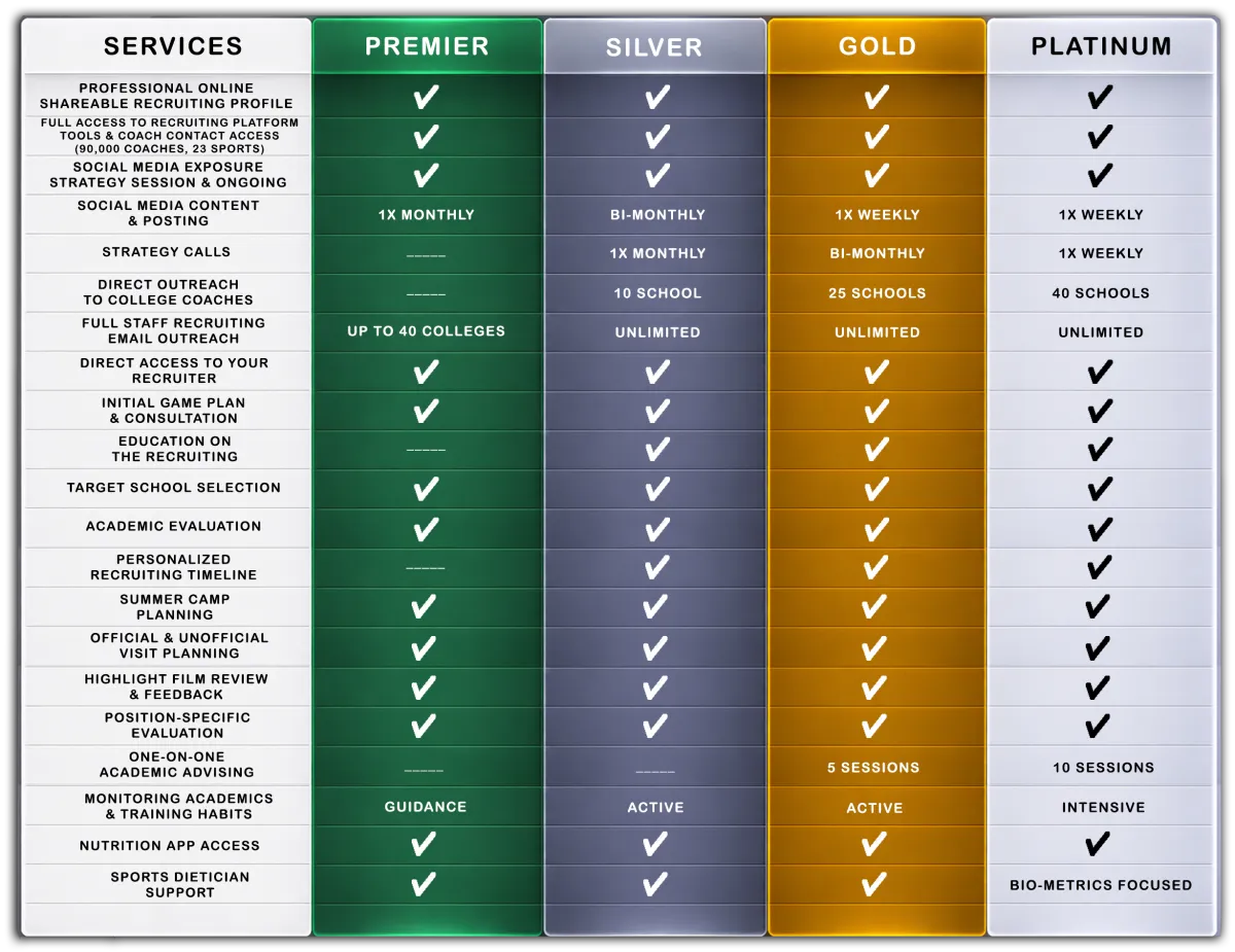 Packages vary as they are customized to the athlete's needs, but may include film evaluation, highlight video creation, a personalized recruiting plan for best fit athletically and academically, outreach to college coaches, academic/eligibility guidance, exposure strategies, and ongoing communication with families.